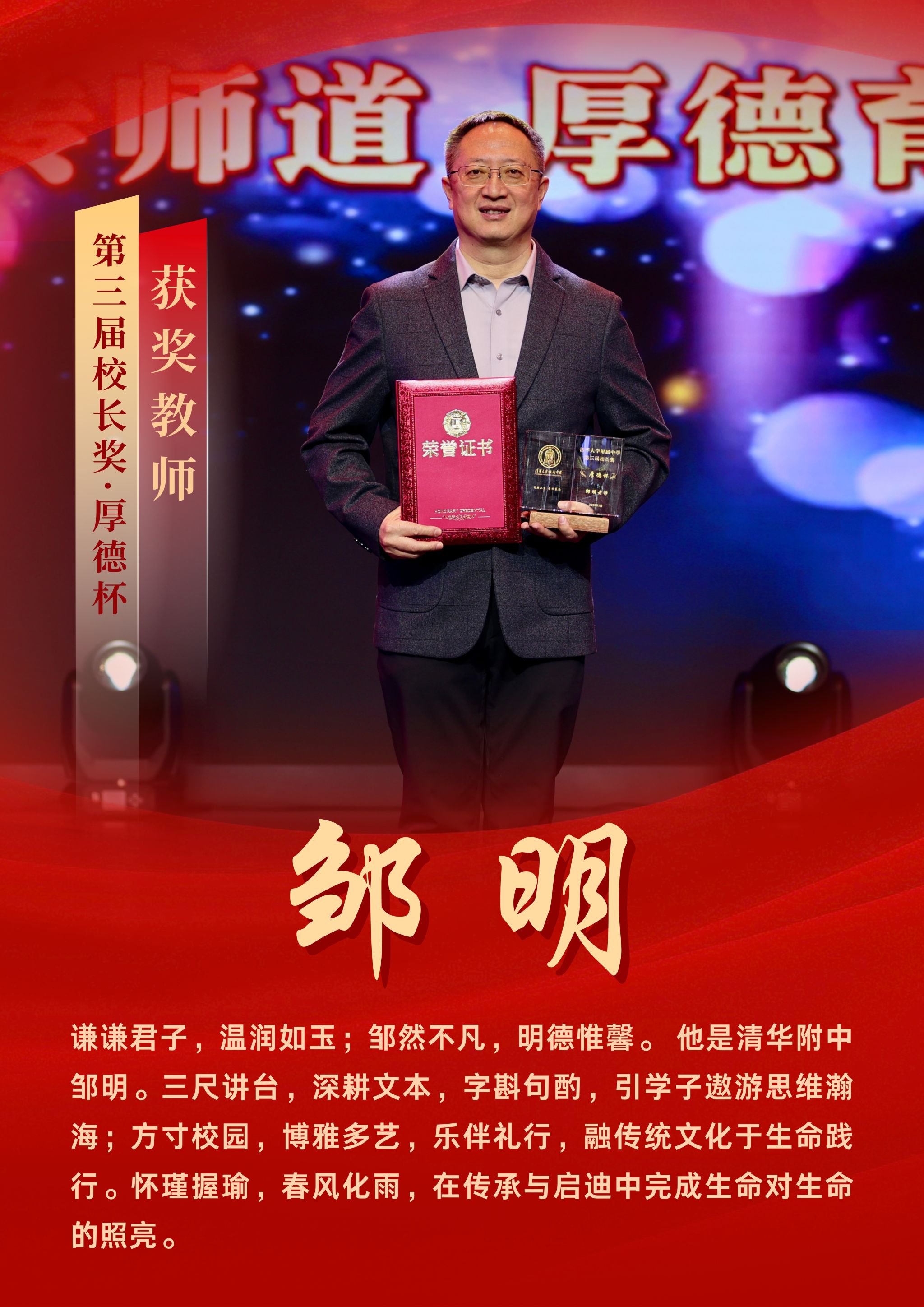 邹明,任教30年,担任班主任18年,语文教研组组长,北京市骨干教师。曾获评清华大学先进工作者,北京市中小学“学生喜爱的班主任”,海淀区语言文字先进工作者,海淀区优秀四有教师。北师大学科教学专业实践导师,海淀区兼职教研员。在他的带领下,语文组形成名著阅读教学体系,获评海淀区名著阅读基地;重视优秀传统文化的传承,先后开设《瓷器鉴赏》《中国传统文化选讲》《人间词话》《书法入门》等选修课,完成《论语》从导读、章则解读、活动实践到练习巩固全课程设计,《论语》整本书教学在市区起到了引领作用;每年组织学生参加北京市中小学读书分享活动,学生语言能力提升系列活动,“书香燕京”阅读指导活动,“中华经典诵写讲”活动,发起组织教育集团第一届史铁生杯作文大赛,取得丰硕成果。每年带领语文组为学校教师节大会、启迪奖、校长奖、校庆等系列活动的文字撰写做出贡献。