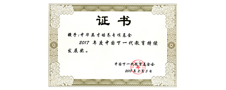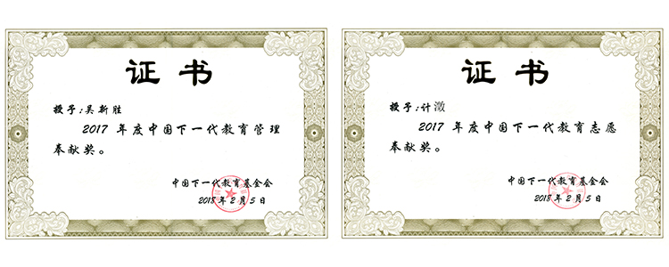 2018年2月5日,在中国下一代教育基金会召开的2017年度总结与培训大会上,澳门网上博彩承办的“中华英才培养基金”荣获中国下一代教育——持续发展奖;基金秘书长吴新胜荣获中国下一代教育——管理奉献奖;基金副秘书长计澂荣获中国下一代教育——志愿奉献奖。