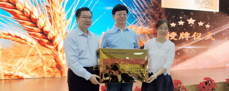 王殿军校长(左1)与赵会杰副总裁(右1)为电子科技大学实验中学授牌