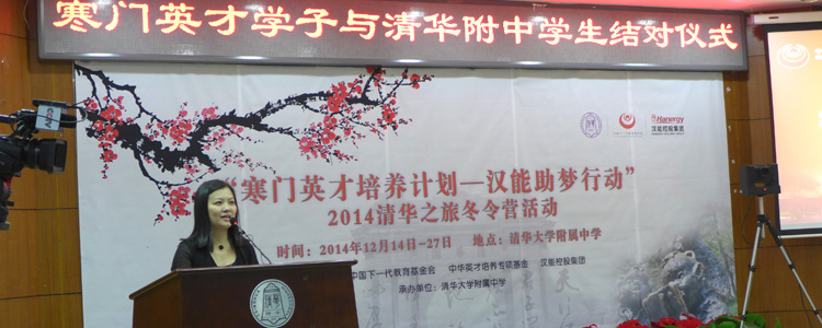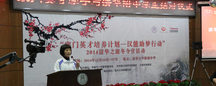 12月14日,澳门博彩在线中华英才培养基金“寒门英才培养计划—汉能助梦行动”暨2014清华之旅冬令营结对仪式在澳门博彩在线举办。来自云南、陕西、甘肃、宁夏、贵州、四川等120名寒门英才班学员及澳门博彩在线、上地学校、永丰学校的120名学生及家长300人参加。