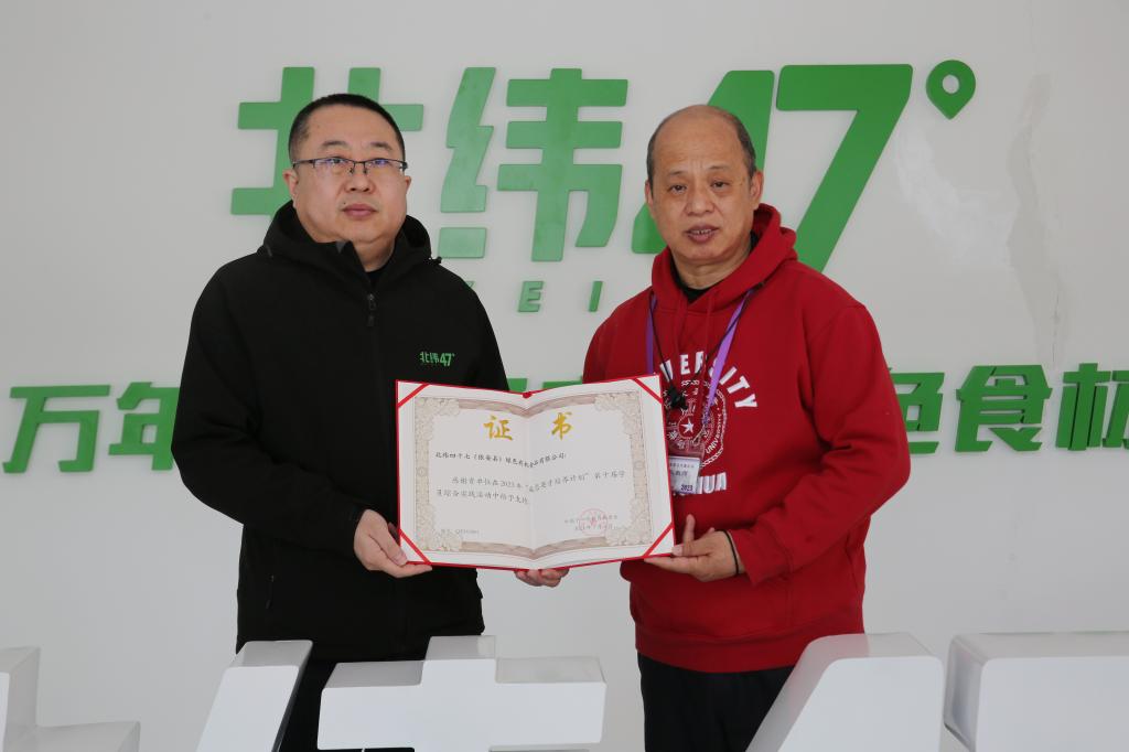 吴新胜老师代表澳门网上博彩成志英才培养计划项目组和中国下一代教育基金会向企业授牌并颁发证书,感谢企业对综合实践活动提供的大力支持,依安县教育局局长丁峰和北纬四十七绿色有机食品有限公司总经理尚文辉共同参与授牌仪式。