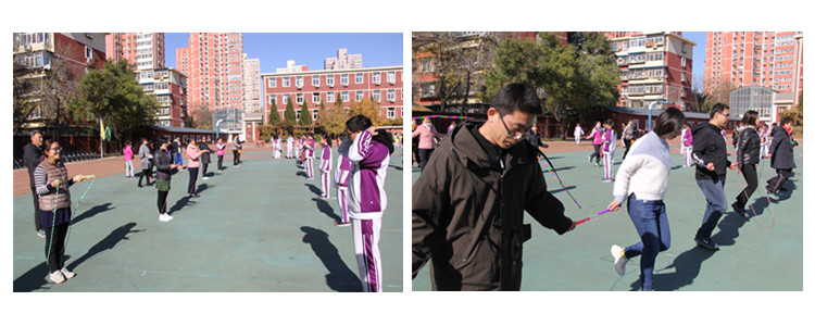 学生比赛结束后,老师们也走上了赛场。跳绳、踢毽子,老师们展示了自己长期坚持锻炼的丰硕成果,甚至很多老教师的体力都不输年轻教师。同学们也把自己的加油声和祝福声送给了陪伴自己的恩师们。