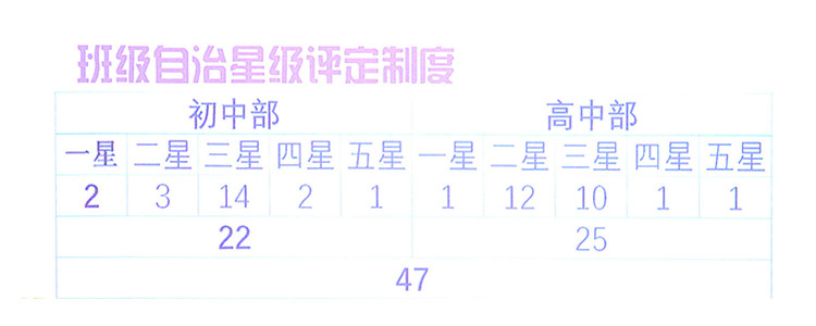 自治班级采取逐级申报制,班级有一项特色在年级中特别突出,可以认定为一星自治班级;有三项特色突出,可以认定为二星;通过一个月的考察,班主任在与不在,班级各项表现都特别突出,可以认定为三星班级;三星班级继续申报四星,要经过三个月的暗中考察,班主任和学校管理者不对班级运行进行主动干涉,班级各项表现都能保持优秀者,可以认定通过;四星班级申报五星,要考察六个月,要在两次大考中实现无人监考。