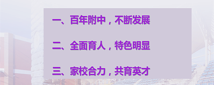 介绍完毕,王殿军校长开始讲座,讲座主要从“百年附中,不断发展”,“全面育人,特色明显”,“家校合力,共育英才”三个方面展开。