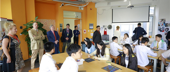 代表们走进教室参观先进的教学、研究设施,走进版画课堂观看学生们的上课情况,并向王实校长咨询课程设置、学生培养方式等问题。王实校长解释道:“海淀凯文学校的课程体系是中西融合的。我们培养学生国际视野的同时,也强调中国根基的重要性。我们希望培养出具有多样性、个性和特色优势的学生,因此我们帮助学生去寻找真正喜欢的,寻找自身的价值。”代表们还走进化学教室,和中学科学组组长刘喜平老师交流了科学学科的课程内容、化学学科的教学方法、学生的日常研究内容等。