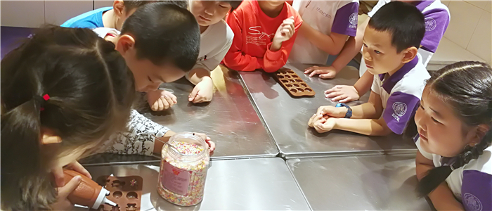 职业体验第一站:巧克力邂逅。巧克力是怎么做出来的呢?答案揭晓!把原料倒入模具,撒上一些五颜六色的配料,再放到冰箱里冷却——好味道,好开心!