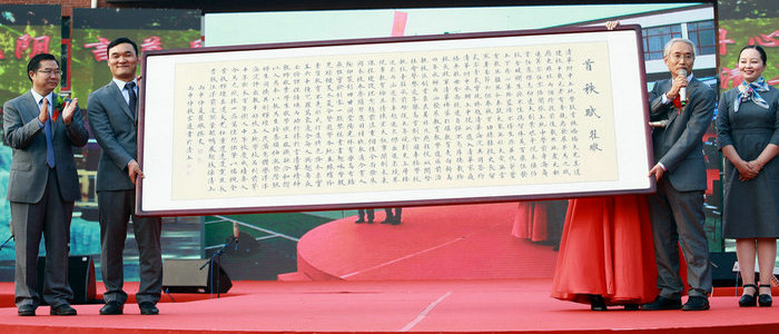 校长在校庆签名板上签名留念