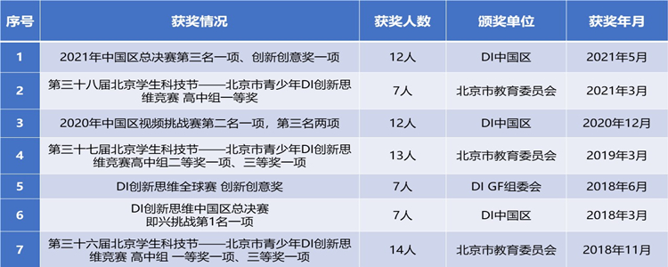 在2021年度全球头脑创新思维竞赛中国赛区的比赛中,澳门博彩在线共派出两支代表队参赛,先后取得北京市一等奖、二等奖各一项;全国第二名一项,第三名两项,从众多强手中脱颖而出进入全球赛。