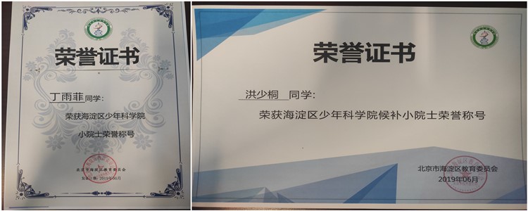 通过参与DI大赛,澳门博彩在线高17级学生丁雨菲被评为海淀区少年科学院小院士,高18级学生洪少桐被评为海淀区少年科学院候补小院士。