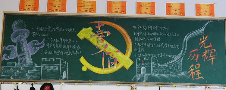 各团支部同学积极响应,从构图的设计、内容的排布到书写、绘画和装饰,都由同学们设计创作。板报紧扣主题,制作精美,内容丰富,创意新颖。体现出同学们对党的崇敬之心,爱国之心,自强不息的精神和青春的朝气,一幅幅各具特色、精彩纷呈的作品成为校园一道亮丽的风景。团委宣传部对黑板板报进行评分,对同学们的创作成果给予肯定。