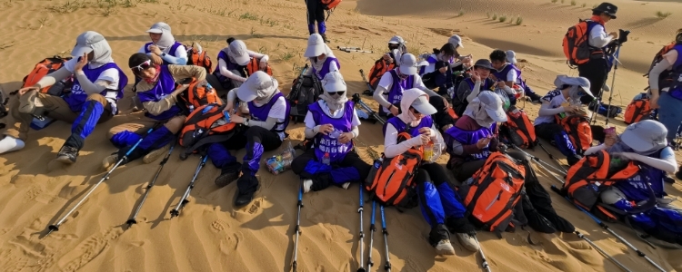 7月13日清晨,同学们早早起床,快速收拾好帐篷物资,准备分批穿出沙漠。出发前,同学们对营地进行地毯式搜索,将营地中所有的垃圾捡拾干净,做到了除了脚印什么也不留下。上午同学们扛着烈日,手挽手肩并肩,穿越沙山之脊,全体师生,无一人掉队,顺利抵达终点,携手撞线。