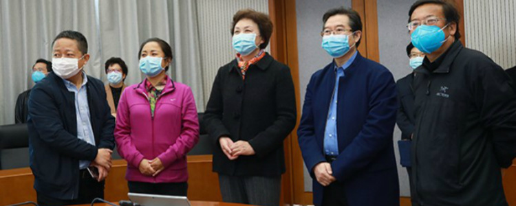 王殿军(一排左一)向陈旭(一排右一)介绍附中疫情防控工作