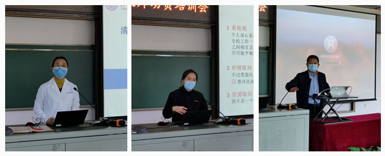 医务室负责人王艳敏、心理中心负责人陈明秋、网络中心孙书明主任给老师们做相关培训