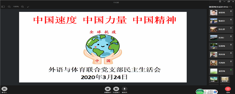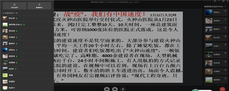 3月24日下午,外语与体育联合党支部召开了主题为“中国速度、中国力量、中国精神”的线上民主生活会。本次民主生活会由支部书记黄丽梅主持,支部全体党员共30人参加。