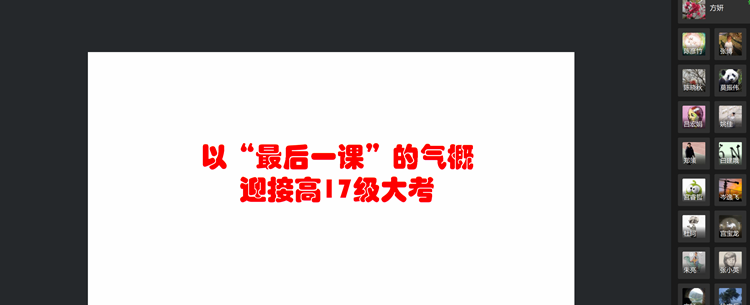 方妍书记提出在这样一个疫情中停课不停学的特殊时期,教师更要想到自己的天职,做到无问西东,无怨无悔。克服压力、自我成就,感动学生。把这次疫情当作修炼内心的道场,有所感悟,升华思想。要找到能感知学生线上学习状态的“传感器”,以“最后一课”的气概迎接高17级大考。
