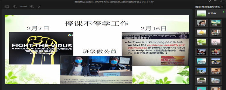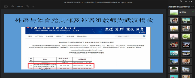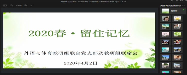 4月2日下午,外语与体育联合党支部及教研组召开了主题为“2020春·留住记忆”的线上联席会。本次联席会由党支部书记、英语教研组长黄丽梅主持,外语与体育教研组及马班办公室共66人参加。