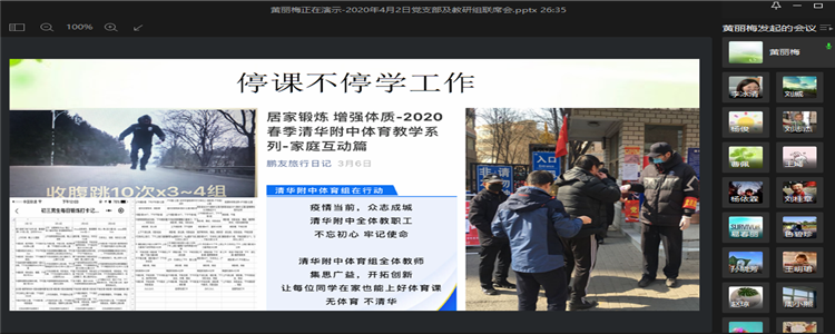 黄丽梅同志还介绍到,此次疫情使得体育教研组的线上教学格外艰难,缺场地、缺器材,可谓困难重重。体育组教师积极响应号召,集思广益:有的教师在家录制内容丰富的锻炼视频,有的在线制作健身微信公众号,有的利用网络监督学生在家进行个人训练,有的积极共享各类型的健身方案,帮助师生在家期间也能锻炼身体,增强体质。
