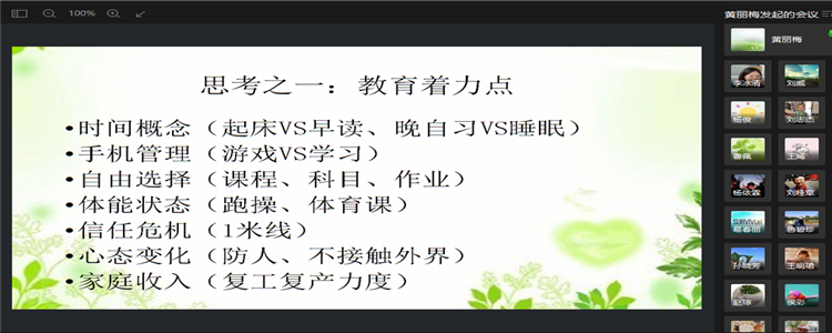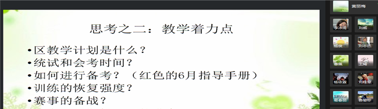 最后,党支部书记黄丽梅建议老师们观看清华大学王教授的讲座“大灾之后的省思”。并且,结合自己的本职工作深入思考。大灾之后,未来教育教学的着力点,以及新的变化所带来的新挑战。她指出:在教育中,应着力关注学生的心态变化,手机管理,体能变化等问题。班主任应及时收集信息,将学生调查问卷的信息及时反馈给任课教师或家长。家校通力合作,帮助学生适应线上上课的节奏。在教学中,任课教师在课表的上课时间要在线,及时解答学生问题,做好数据的统计工作,及时提醒离线的学生等,同时也要思考线上与线下课程的衔接。体育老师应持续关注学生的训练强度和赛事备战等。全体教师要提前做好线下开学的教育教学储备工作。相信只要老师们思考在前,规划在前,一定能够带领学生健康平稳地度过这段特殊时期。