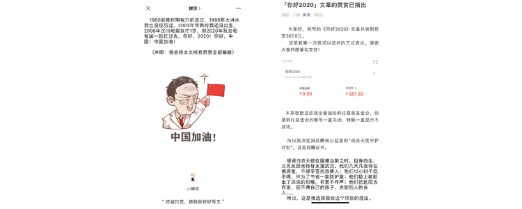 她爱写作,有自己的公众号,于是决定做好自己、通过写“战疫”话题来宣传正能量。2月2日,她提笔写下《你好2020》,在文中赞美白衣天使拿生命奉献、赞美雷霆军医从天而降,赞美全国人民万众一心,她说“2020年我会和祖国一起扛过去”。在此文末,她表示会将本文所有赞赏都捐给抗“疫”一线。原本只是分享作文的公众号,竟意外收到近400元的赞赏。随后她毫不犹豫将这笔钱捐给了疫情相关基金会。一片雪花落在地上会迅速融化,但十几亿片雪花会呈现出“千里冰封,万里雪飘”的壮美景象!做好每一个小我,就会“月余,疫除,终胜。此后百年,国泰民安!”