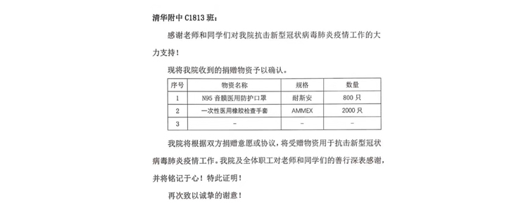 积力之所举,则无不胜也;众智之所为,则无不成也。这个冬天,每一位坚守在抗“疫”一线的工作者们不懈地奋斗,用顽强的坚守,带给了我们无限的希望。猪年岁末学校的春联大赛中,附中学子曾撰写“博雅君子心系天下,有梦少年身在清华”,在疫情面前,他们没有把自己当成局外人,没有把自己当成需要被守护的孩子,相反他们以实际行动践行着自己的理想、书写着自己的担当。越是困难时刻,越能见证无私奉献的可贵;越是危机关头,越要凝聚同舟共济的力量。衷心地感谢附中学子们以及家长们的奉献,让我们一起,等待抗“疫”胜利,等待春暖花开。