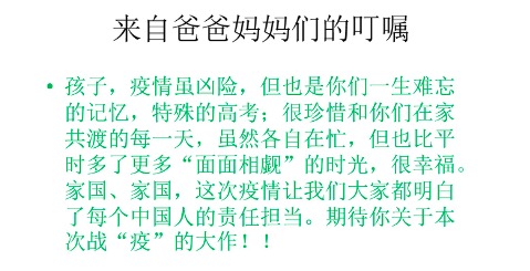 面对疫情,全国人民众志成城,相信我们一定会赢得这场战“疫”的胜利。这次班会同样凝聚了全体同学的意志,激发同学们线上学习的动力。面对停课不停学的战场,附中高三的全体学生一定准备好了,也一定会一战而胜。