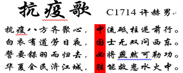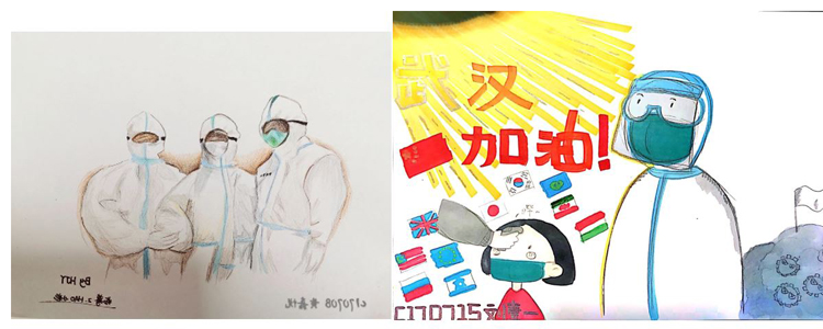 在这场疫情中,有无数的逆行者,他们无法与亲人团聚,坚守在抗击疫情的一线。同学们在学习生活之余,用漫画、海报、诗词、音乐作品等多种方式,表达出对疫情的正能量,献上战胜疫情的一份温暖。以下是部分精彩作品。