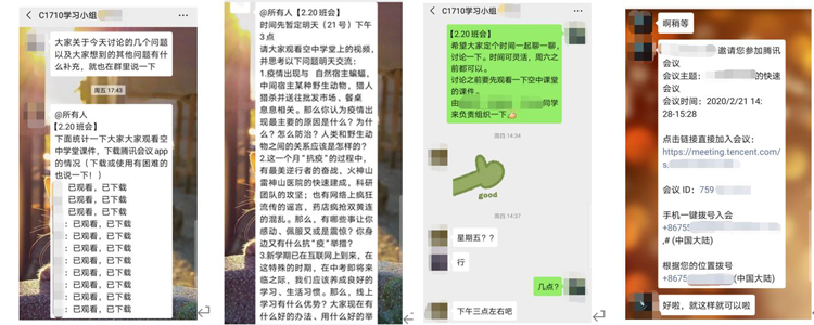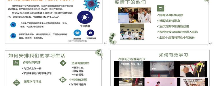 随后, 各班分别围绕“疫情防护知识” “如何有效进行线上学习”“抗疫正能量”等主题组织了形式多样的小组线上讨论。