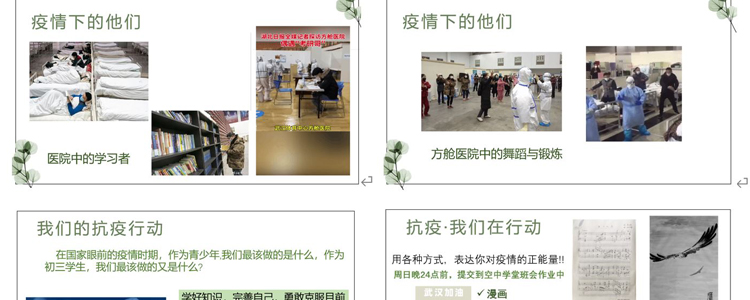 最后,全年级同学共同分享了钟南山、李兰娟科研工作者利用知识抗疫,火神山医院火速建成的中国奇迹,医护人员、社区工作者、建筑工人等奋战在一线的身影,方舱医院中病人和医生的健身广场舞,隔离医院中静心学习的高三学子等等正能量事迹,引导学生用乐观、积极的心态面对生活。