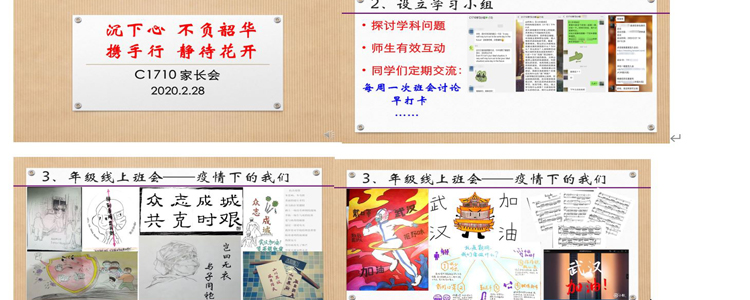 初1713班:主题是“传家国情怀,促学习发展”。分三个部分:有效态度、成绩分析和学科介绍。在特殊时期培养学生关注社会、增强社会责任感。同时,面对所处的网络信息时代,关注学生所处的网络生态,引导学生正确理性对待网络信息。最后,结合第一次班会作业内容,选出优秀作品制作视频穿插在家长会视频中,更好地体现学生在疫情期间所表露出的家国情怀。