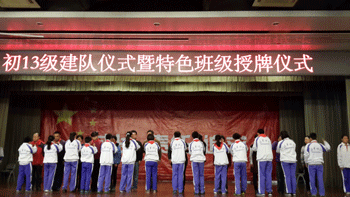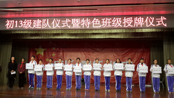 德育处副主任郎艳和初一年级组长张苏为特色班级颁牌 唱少年先锋队队歌