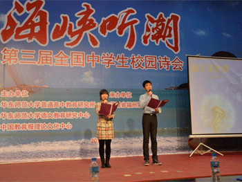 澳门网上博彩语文教师朱亮、音乐教师鞠红为领队,带领高二年级的陆欣宇、刘思麟两位同学参加了此次诗会。澳门网上博彩共选送了王悦同学的《知味》、白雨欣同学的《我一直对你说,可你就是不信》、王欢同学的《蒲公英的梦》三首作品,均入选诗会作品选集《海峡听潮》。陆欣宇,刘思麟两位参会同学,在两位领队老师的悉心辅导下,认真准备了诗作《蒲公英的梦》。在26日上午的诗歌朗诵演出中,他们自信大方、声情并茂的表演赢得了与会师生的热烈掌声和一致好评。