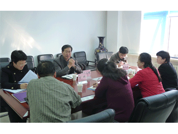 附中党委书记方妍(右2)做汇报 姜胜耀(正面左2)与大家进行深入交流