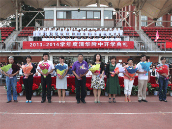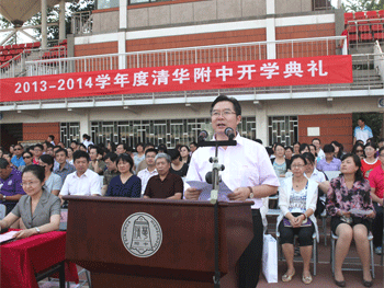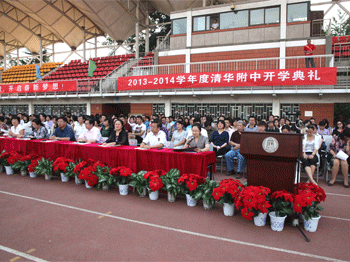 教务主任朱培(前右1)主持开学典礼 王殿军校长在开学典礼上致辞