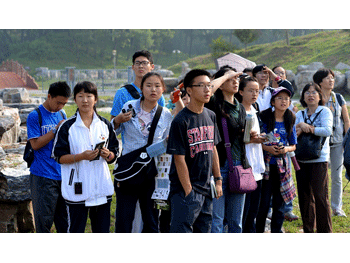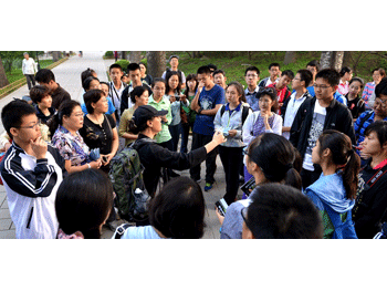 同学在观察搜寻鸟儿的踪迹 澳门网上博彩48名参加圆明园观鸟活动的同学合影