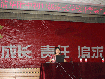 王殿军校长(前中)致辞 德育处副主任郞艳对家长提建议