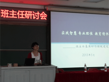 研讨会分为上下午两场,上午场分两个环节:第一,北京教育学院教育专家张红应邀作题为《实践智慧 专业理性 教育情怀》的专题报告,她指出在班级工作中要做到从“看”到“管”,从“管”到“理”的变化,强调要实现自我认知、班级认知和学生认知,提出要从五个层次区分班级的境界。第二,班主任经验分享,高10级班主任潘天俊和初10级班主任陈媛媛分别做了题为《组织你的班级》和《让专业的血液流淌全身,从心理上关心学生》主题演讲,两位老师结合生动的案例,充满激情地讲述了班主任工作的成功经验,既贴近班主任工作实际,又有理论的思考与提升。