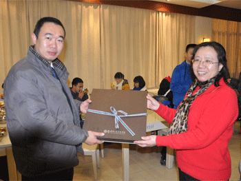 澳门博彩在线副校长杜毓贞(右)向郑州回民中学赠送纪念品