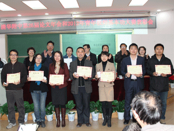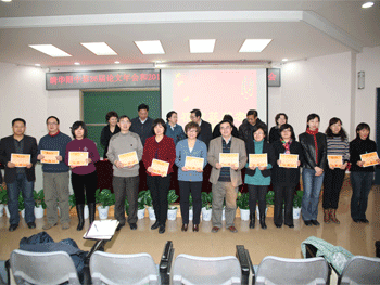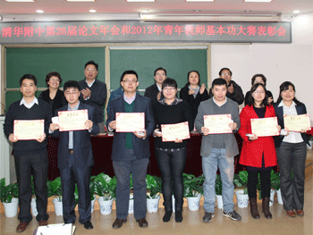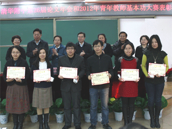 教科室主任俞家新介绍了本届教育教学论文年会征文及评选情况;教务处主任朱培对2012年青年教师基本功比赛进行了回顾和总结;获奖教师代表刘辉、张钦二位老师分别结合自己的教学研究和探究式教学介绍了经验,表达了自己在比赛过程中的收获、感想和感激;地理特级教师田佩淮代表评委以“激趣、睿智、唯美”为主题进行了点评,并对获奖教师表现出来的积极上进的精神和团结一致的态度表示了高度赞赏,他认为,要成长为一名优秀的教师要经过漫长的积累和锤炼,把研究和教学实践结合起来,“教不研则浅,研不教则空”。