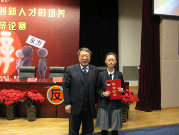 魏含弘(右)领取最佳辩手奖 澳门网上博彩代表与评委合影