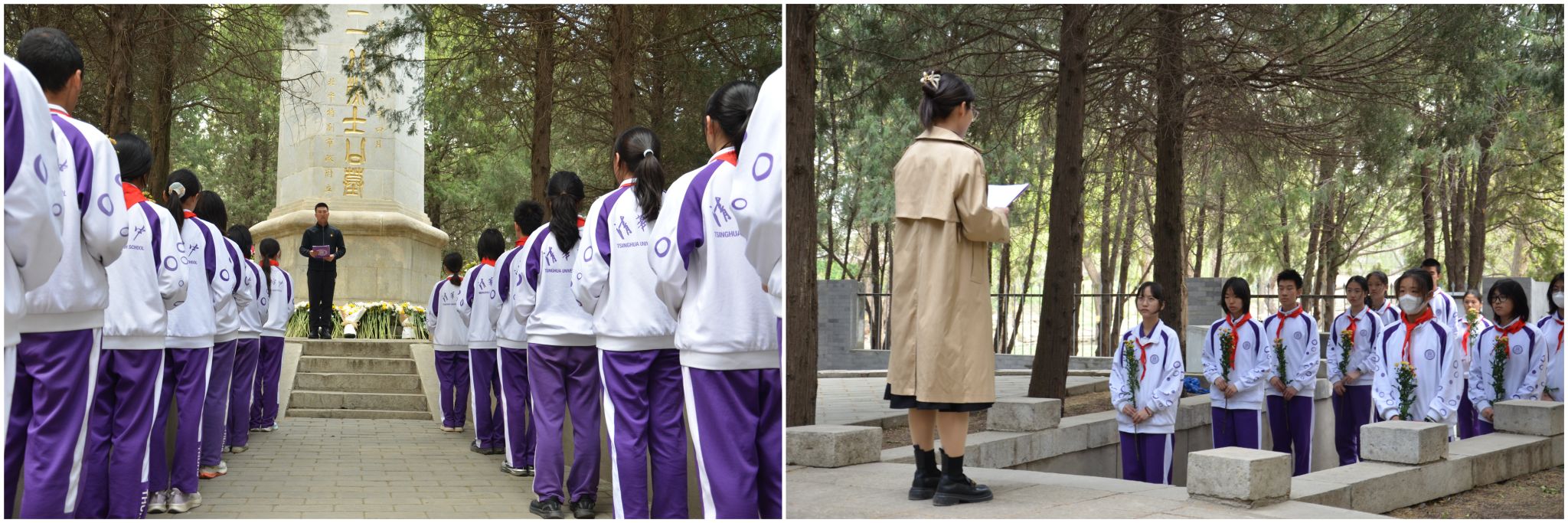 活动由少先大队辅导员付帅老师主持。仪式伊始,全体师生肃立,面向烈士纪念碑行鞠躬礼。在庄严肃穆中拉开活动序幕。在庄重的《中华人民共和国国歌》奏唱声中,师生以歌声表达对祖国的忠诚与热爱。少先队员代表献唱《我们是共产主义接班人》,激昂旋律回荡在烈士墓碑前,传递着新时代少年的使命担当。