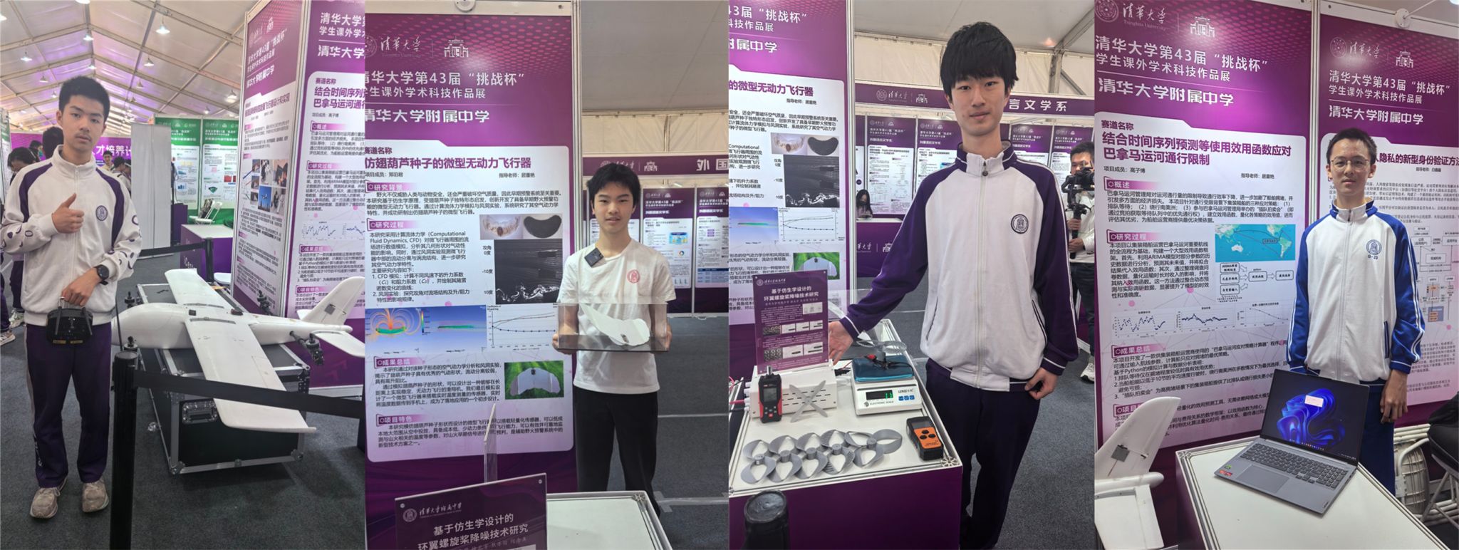 澳门网上博彩的参展作品分为实物互动作品和海报作品两部分。实物互动作品包括“垂直起降倾转四旋翼固定翼飞机”“基于仿生学设计的静音浆”“仿翅葫芦种子的微型无动力飞行器”“自主视力检测”“巴拿马运河通行限制应对策略”共五个项目。