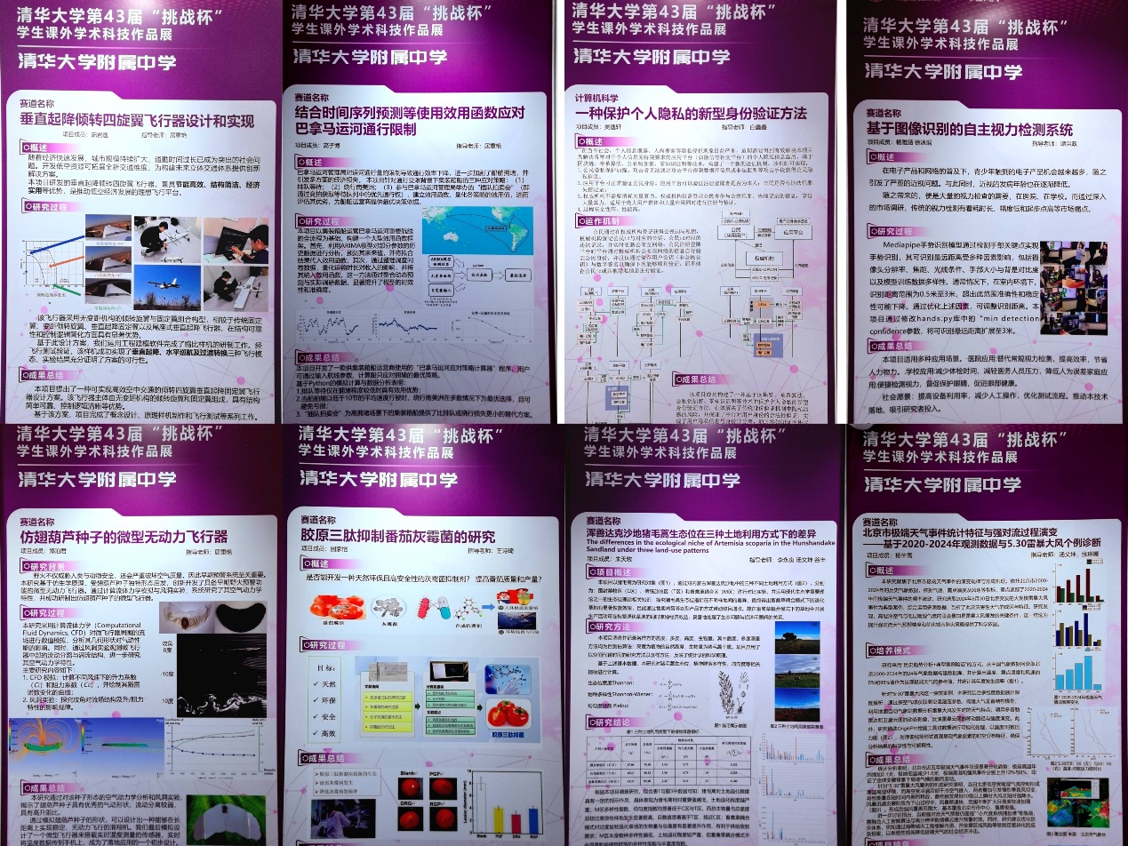 高研实验室及创客空间通过海报的形式展示了《垂直起降倾转四旋翼飞行器设计和实现》《结合时间序列预测等使用效用函数应对巴拿马运河通行限制》《一种保护个人隐私的新型身份验证方法》《基于图像识别的自主视力检测系统》《仿翅葫芦种子的微型无动力飞行器》、《胶原三肽抑制番茄灰霉菌的研究》《北京市极端天气事件统计特征与强对流过程演变——基于2020-2024年观测数据与5.30雷暴大风个例诊断》《浑善达克沙地猪毛蒿生态位在三种土地利用方式下的差异》共八个科研项目的研究成果。