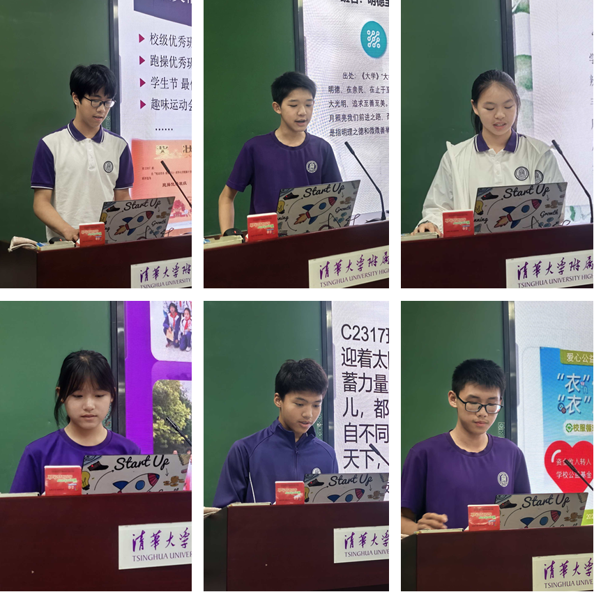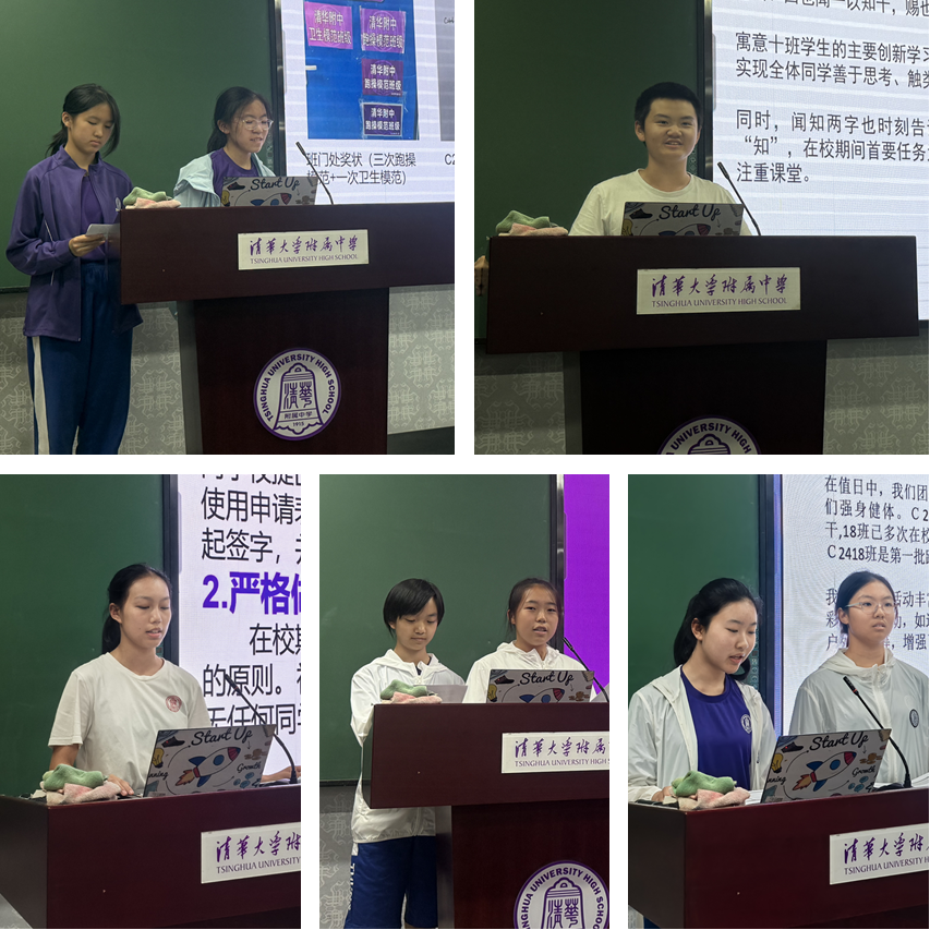 初2406班学生陆雨旸、崔嘉言,初2410班彭芊等进行三星自治星级班级答辩;初2413班刘毓欣进行三星电子设备星级班级答辩;初2415班学生黄可昭、徐雨宸进行三星自治星级班级答辩;初2418班高语竹、王怡宁进行三星电子设备星级班级答辩