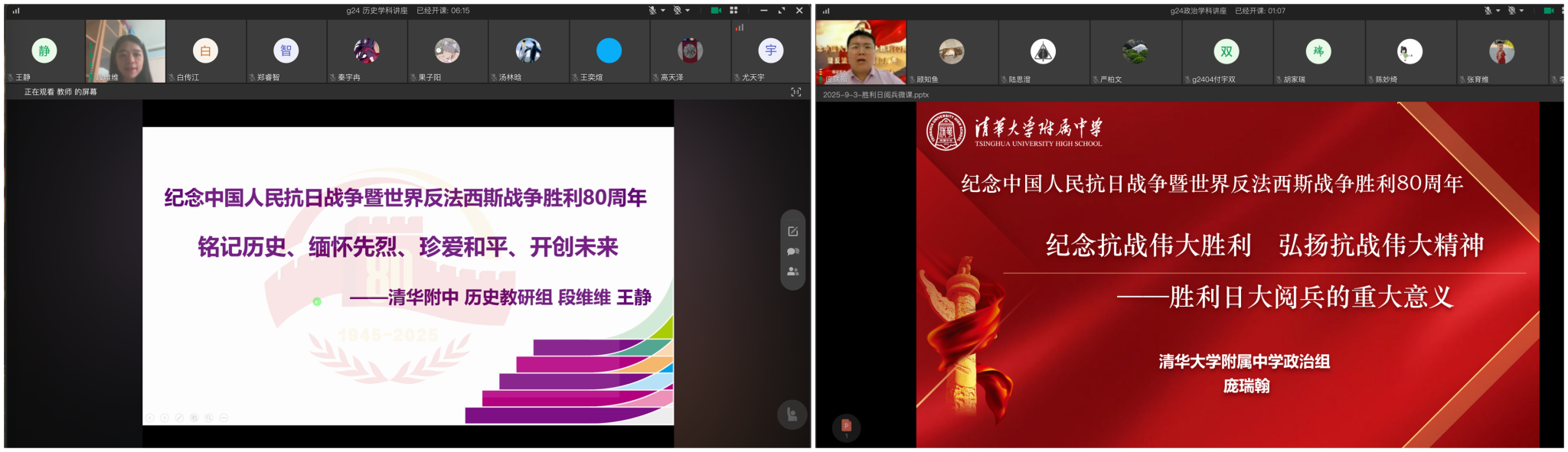 当天下午,历史备课组王静老师、段维维老师与政治备课组庞瑞翰老师结合学科专业背景,分别以“铭记历史、缅怀先烈、珍爱和平、开创未来”和“纪念抗战伟大胜利 弘扬抗战伟大精神”为主题,多角度解读本次阅兵的深刻历史意义与时代价值,以实践创新深入推进学科德育。