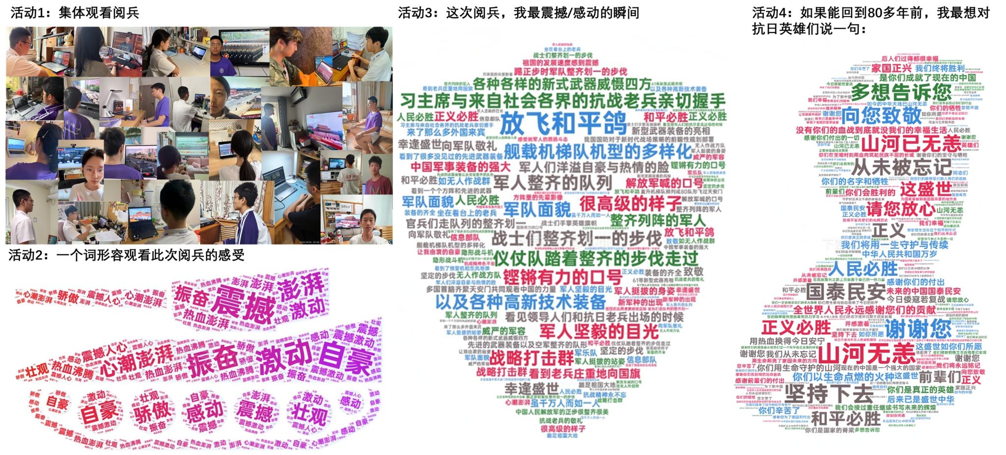 各班以小组为单位,开展分享交流活动和探究性学习,内容包括解读“国之重器”的科技内涵、梳理阅兵历史变迁、分析方阵背后的精神密码等;通过手抄报、研究报告、知识竞赛、诗歌创作等多种形式展示学习成果。同学们积极参与互动问答、观后感分享、时空对话等活动,在交流中深化了对抗战精神与时代使命的理解。