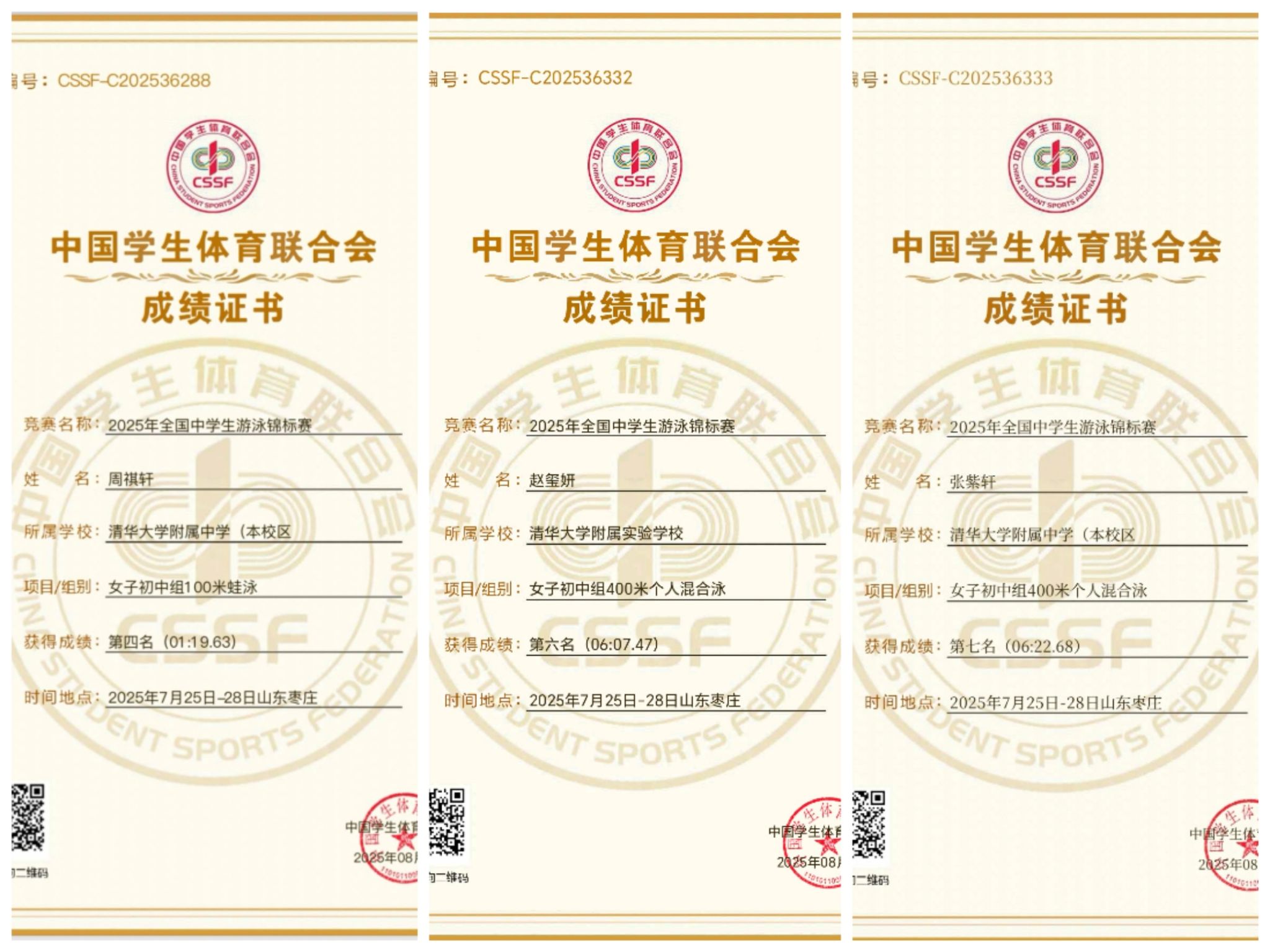 7月25日至28日,2025年全国中学生游泳锦标赛在山东枣庄隆重举行。该项赛事由中国学生体育联合会和国家体育总局游泳运动管理中心联合主办,代表全国中学生游泳最高竞技水平。澳门博彩在线选派初22学部杨紫涵、初23学部赵玺妍、冯潇伊、初24学部周祺轩、汪武天弈、张紫轩、张楚轩、王旻熙共8名同学参赛。
