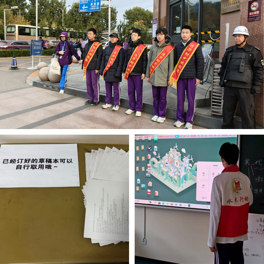水木行动同学参与晨岗、收集废旧试卷装订成草稿纸、在跑操期间为教学楼熄灯断电