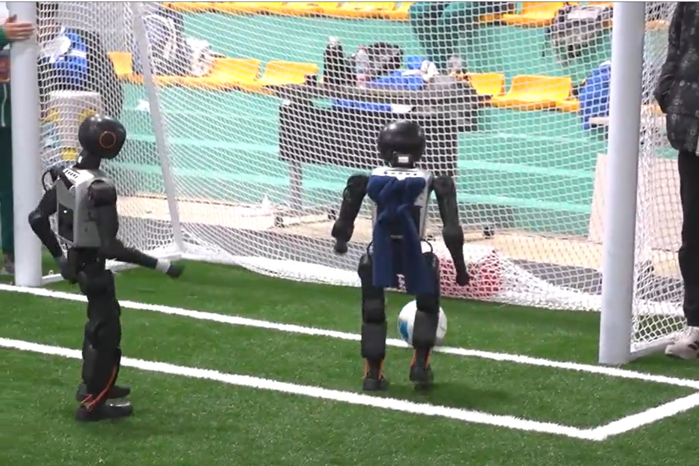 带蓝色围巾的澳门网上博彩机器人完成首例进球的精彩瞬间