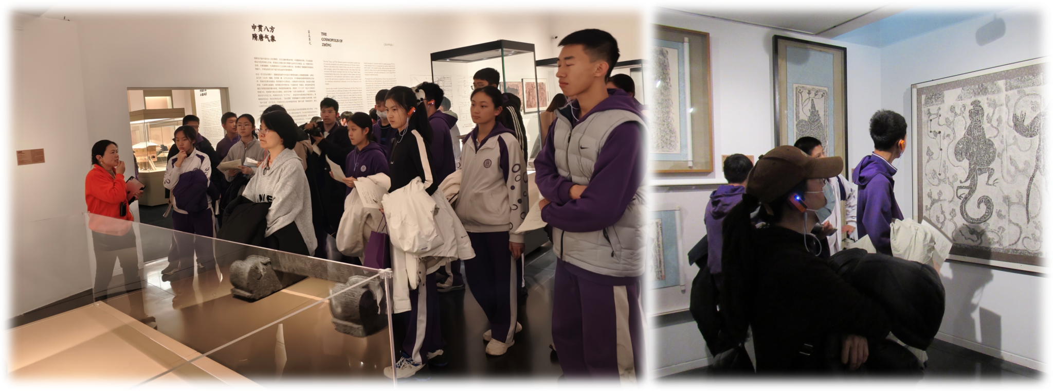 讲解员为同学们介绍文物细节(左)同学们认真观察、思考和记录(右)