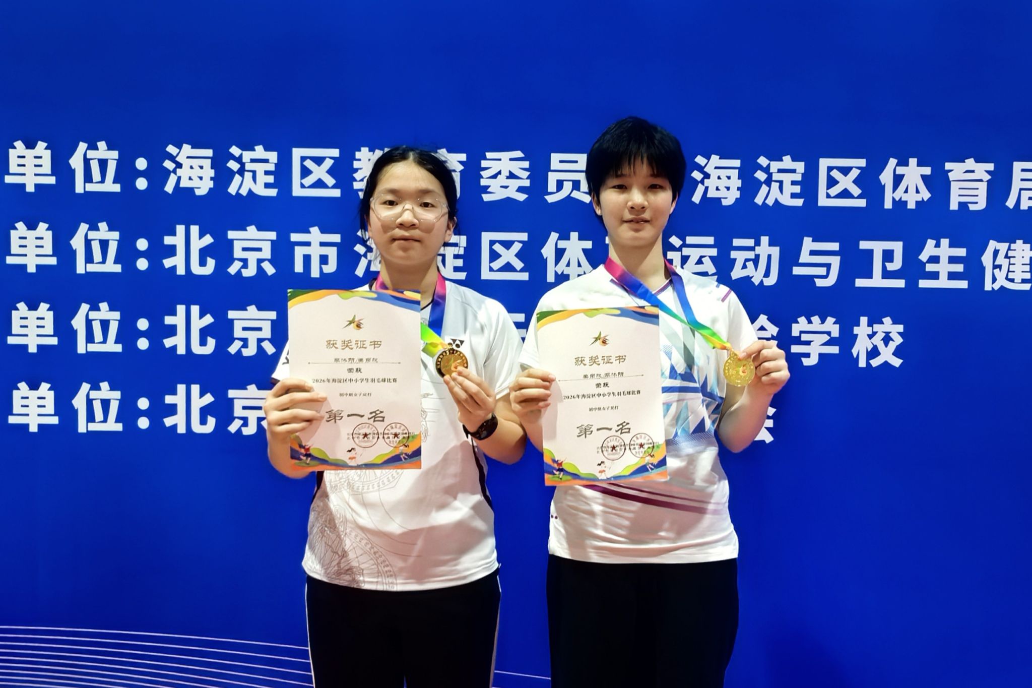 李沐阳、姜帛欣获初中组女子双打第一名